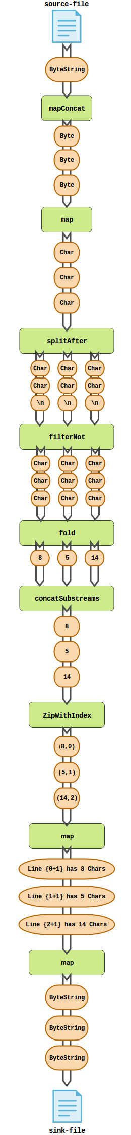 val srcFilePath = Paths.get("local_resources/source-file.txt") val linesSource = FileIO.fromPath(srcFilePath) .mapConcat(identity) // byteStr => byteStr .map(byte => byte.toChar) .splitAfter( ch => ch == '\n') .filterNot(ch => ch =='\n') .fold(0)( (acc,ch) => acc + 1 ) .concatSubstreams .zipWithIndex .map(tpl => s"Line ${tpl._2 + 1} has ${tpl._1} Chars") .map(str => ByteString.fromString(str + "\n")) val snkFilePath = Paths.get("local_resources/sink-file.txt") val linesSink = FileIO.toPath(snkFilePath) val runResult = linesSource.runWith(linesSink)
