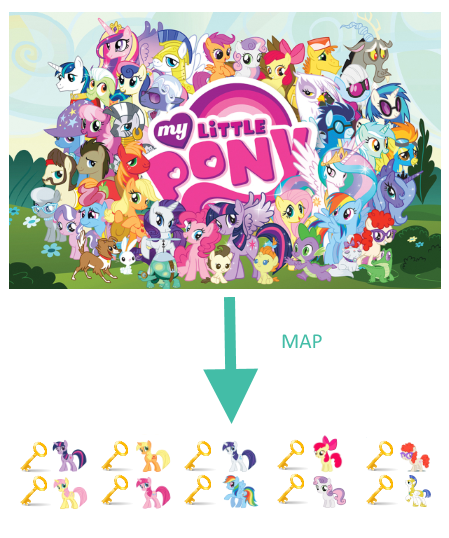 Pour notre exemple, le dataset est l’ensemble des personnages de My Little Pony. Nous allons associer chaque poney (valeur) à un univers My Little Pony (clé).