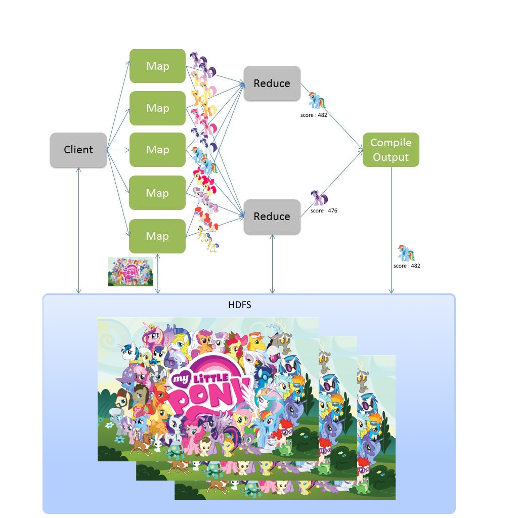 Pour illustrer le procédé mapReduce, nous allons prendre un exemple assez simple. L’idée est d’analyser la multitude de personnages de My Little Pony et de déterminer quel est le meilleur poney via un algorithme très complexe de scoring.