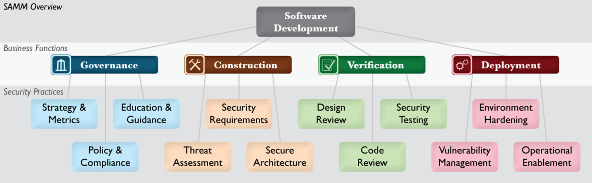Le modèle de SAMM se base sur le métier du développement logiciel et fournit un ensemble de bonnes pratiques de sécurité pour chaque fonction du métier. L’ensemble de ces pratiques permettent aux entreprises de réduire les risques et de s’engager sur la qualité de leurs solutions en matière de sécurité. Voici une vue générale du modèle de sécurité de SAMM.