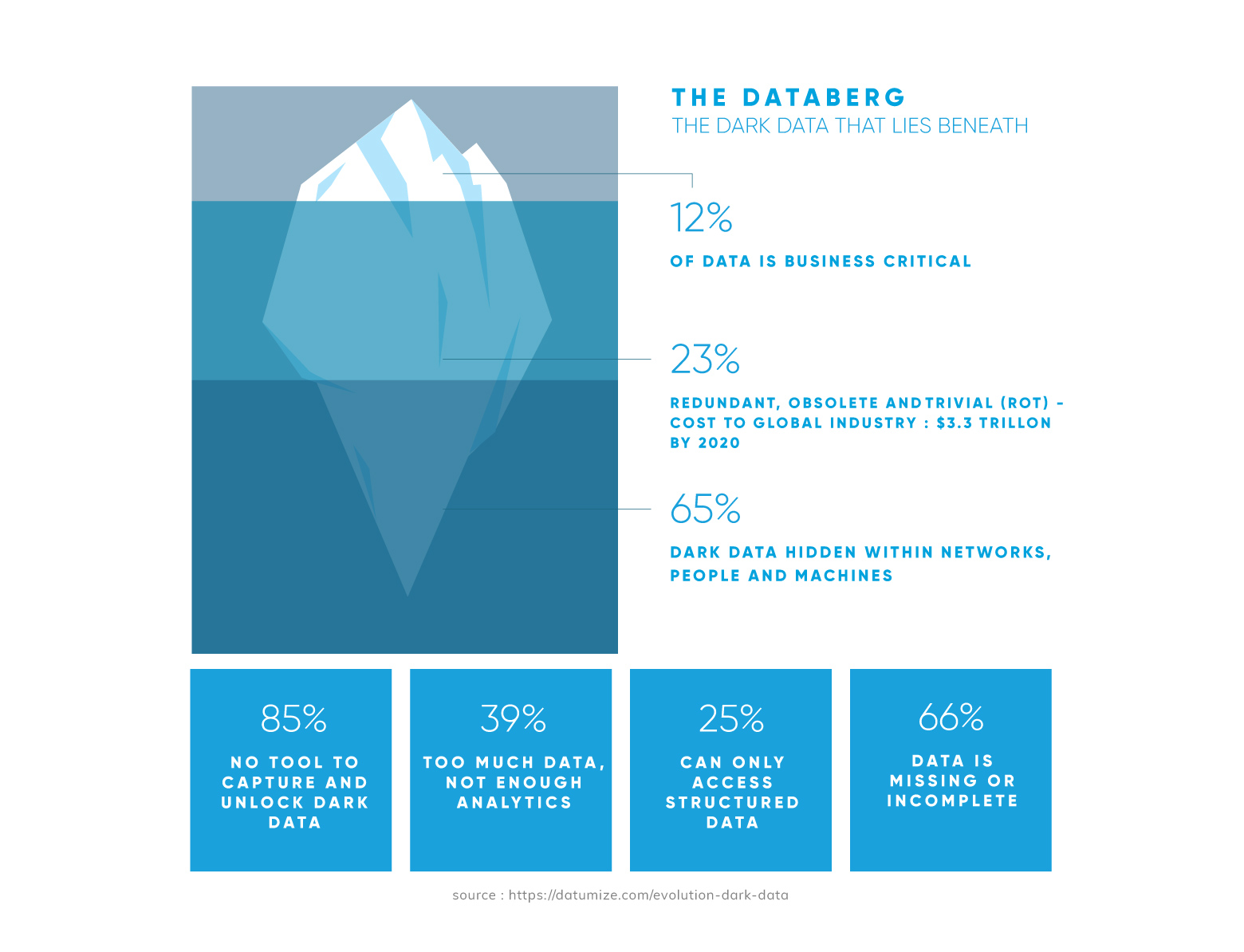 D’après une étude IBM, plus de 80% de l’ensemble des données sont aujourd’hui des Dark Data non structurées. IBM estime que ce taux atteindra 93% en 2020.