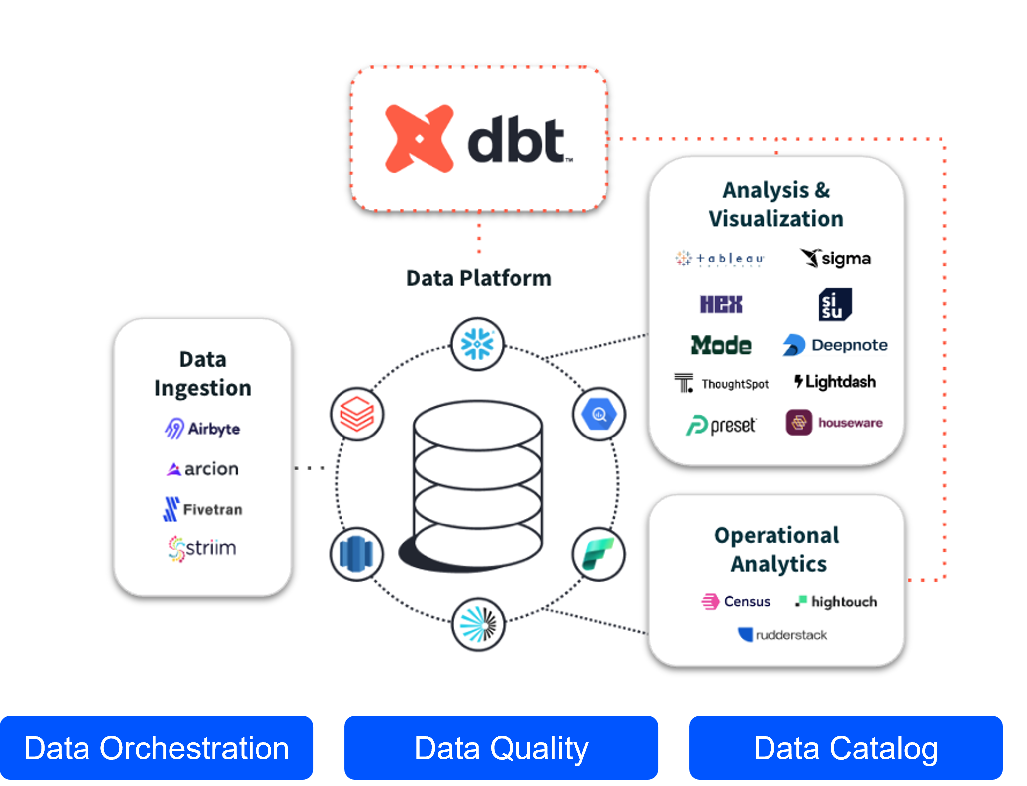 Face à des outils comme Talend ou Informatica qui s’intègrent généralement dans une stack ETL, dbt se démarque sur :