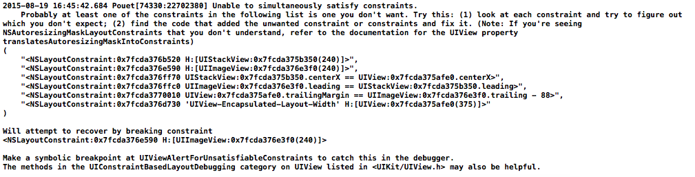 Une autre solution est de regarder les logs de l’application. De base, si le Layout Engine s’emmêle les pinceaux avec les contraintes, dans les logs cela donne ça :