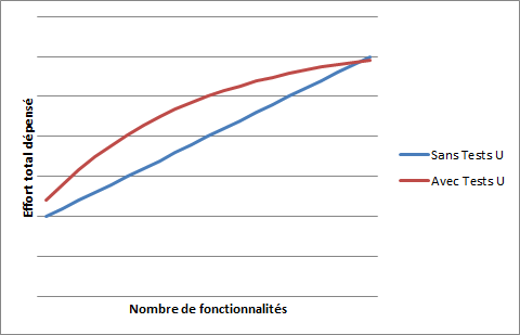 Le problème avec Fischer, est qu’il a essayé de schématiser son argument avec un diagramme d’une façon qui simplifie tellement le problème, qu’on risque de rejeter son argument qui semble pourtant instinctivement correct. Il commence avec une relation linéaire où le coût de la mise en place de tests unitaires est élevé au début, mais au fur et à mesure on gagne du temps.