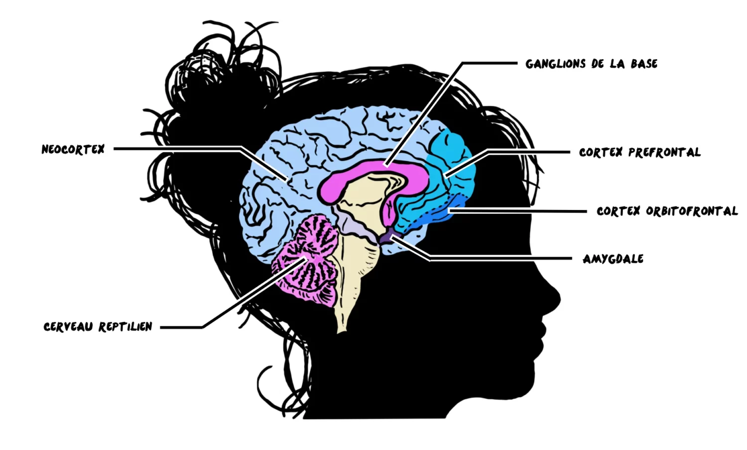 Première partie, le reptilien et les ganglions de la base, en charge des émotions, des réflexes et de la mise en mouvement. Ils couvrent une zone de notre cerveau qui permet l’action rapide. C’est également une zone fort peu consommatrice d’énergie.