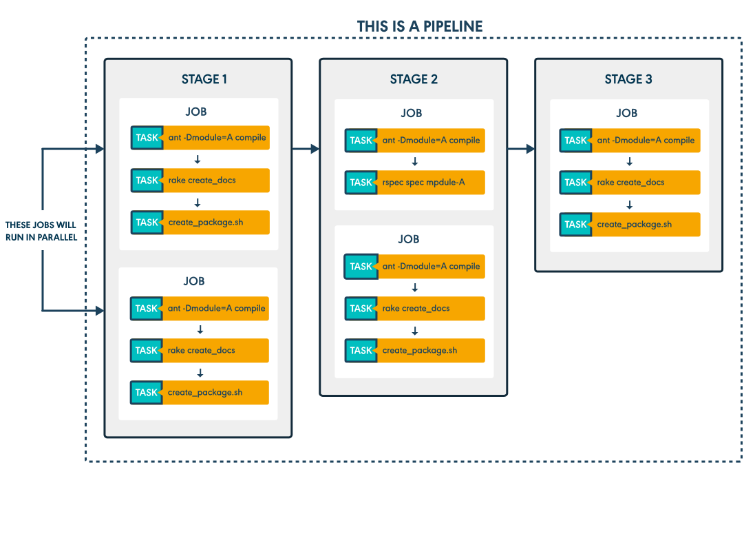 Les étapes les plus communes d’un pipeline seront de construire un binaire de l’application, puis de tester ce binaire, et enfin d’en effectuer la release.