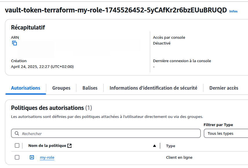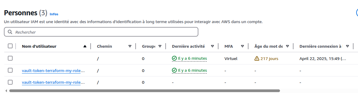 Vous avez besoin d’un utilisateur IAM avec des droits étendus uniquement pour initialiser Vault : c’est-à-dire lui donner la capacité de créer des credentials temporaires via l’API AWS (iam:CreateUser, iam:CreateAccessKey, etc.). Une fois cette étape faite (typiquement lors de l’aws/config/root), cet utilisateur ne sera plus utilisé dans le workflow courant et pourra même être désactivé par la suite ou gardé en backup.